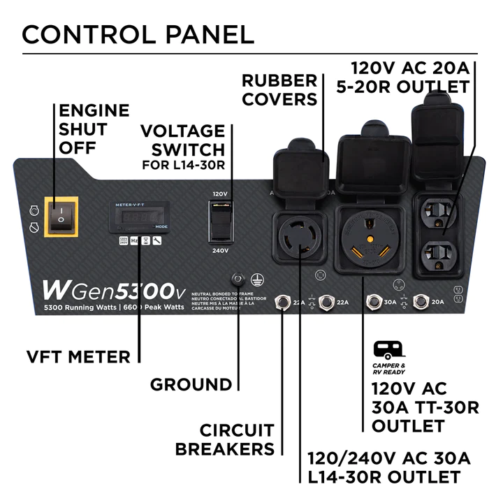The Westinghouse WGen5300v Portable Generator is a convenient generator to keep you powered on the road or at your home during a power outage. With 5,300 peak watts and 6,600 running watts, this generator runs for up to 14.5 hours at a time with a 4.7 gallon (18 L) gasoline fuel tank. The WGen5300v features a powerful 274cc 4-Stroke OHV Westinghouse Engine with a cast iron sleeve designed for durability, featuring a built-in fuel gauge and automatic low oil shutdown. It’s equipped with an RV Ready TT-30R 30A outlet that conveniently hooks to your travel trailer, keeping the air conditioner and travel necessities up and running all day long. Combined with an L14-30R outlet, it’s Transfer Switch Ready for total household power and eliminates the hassle for annoying extension cords or power strips for your home. The WGen5300v is easy to use with an intuitive control panel that houses a 120/240 Volt Selector Switch to draw more power with added flexibility and a Digital Readout which displays real-time information to keep up with regularly scheduled maintenance. Engineered into a compact hardened-steel frame with added roll bars, foam grip handle, and never-flat wheels, it lets you easily move this generator from storage to use. The WGen5300v Portable Generator is complete with a 3-Year Limited Warranty and Lifetime Technical Support, backed by our nationwide Westinghouse customer service and support network.